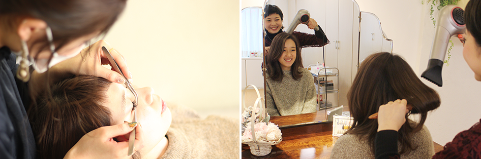 美容室を併設しておりますので、ヘアセットやメイクアップも一緒にご予約頂けます。